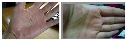 1、手癣脱皮:先一只手出现脱皮现象,随后发展到双手。手掌出现红斑、炎症,瘙痒明显,而且患手癣的患者大多同时患脚癣。